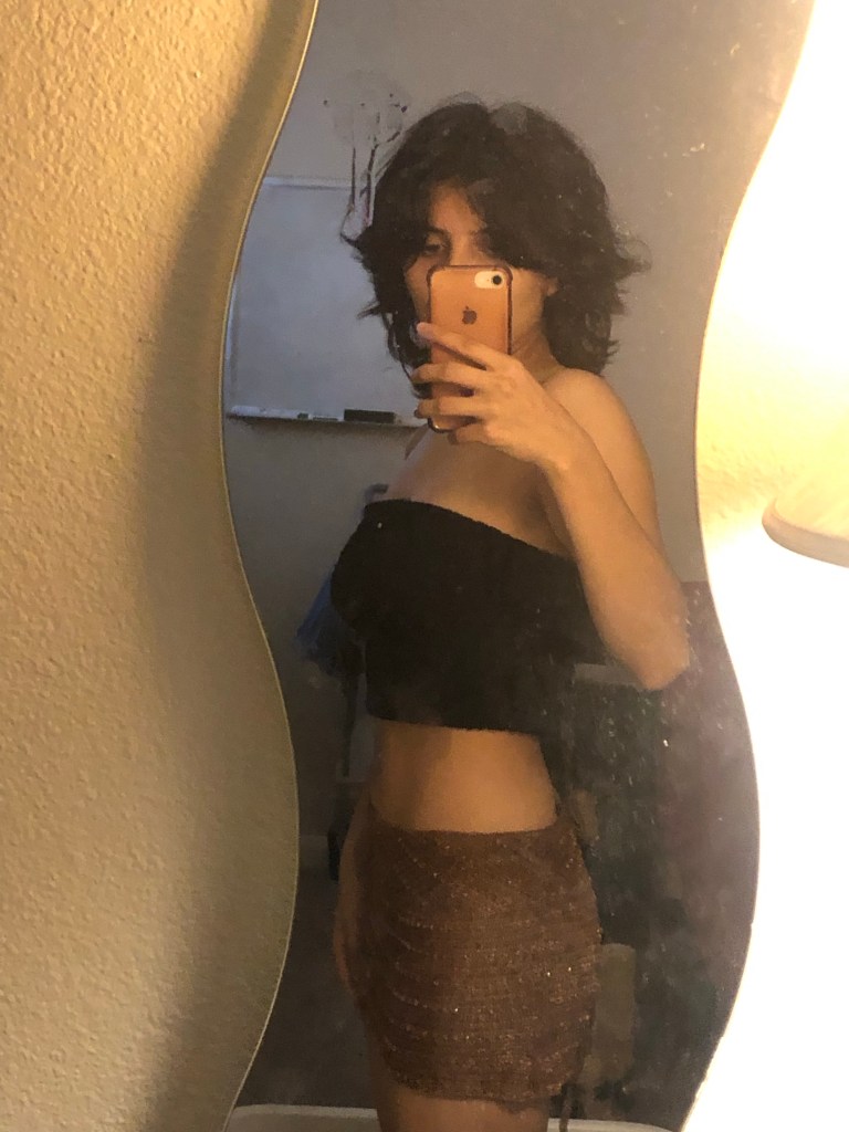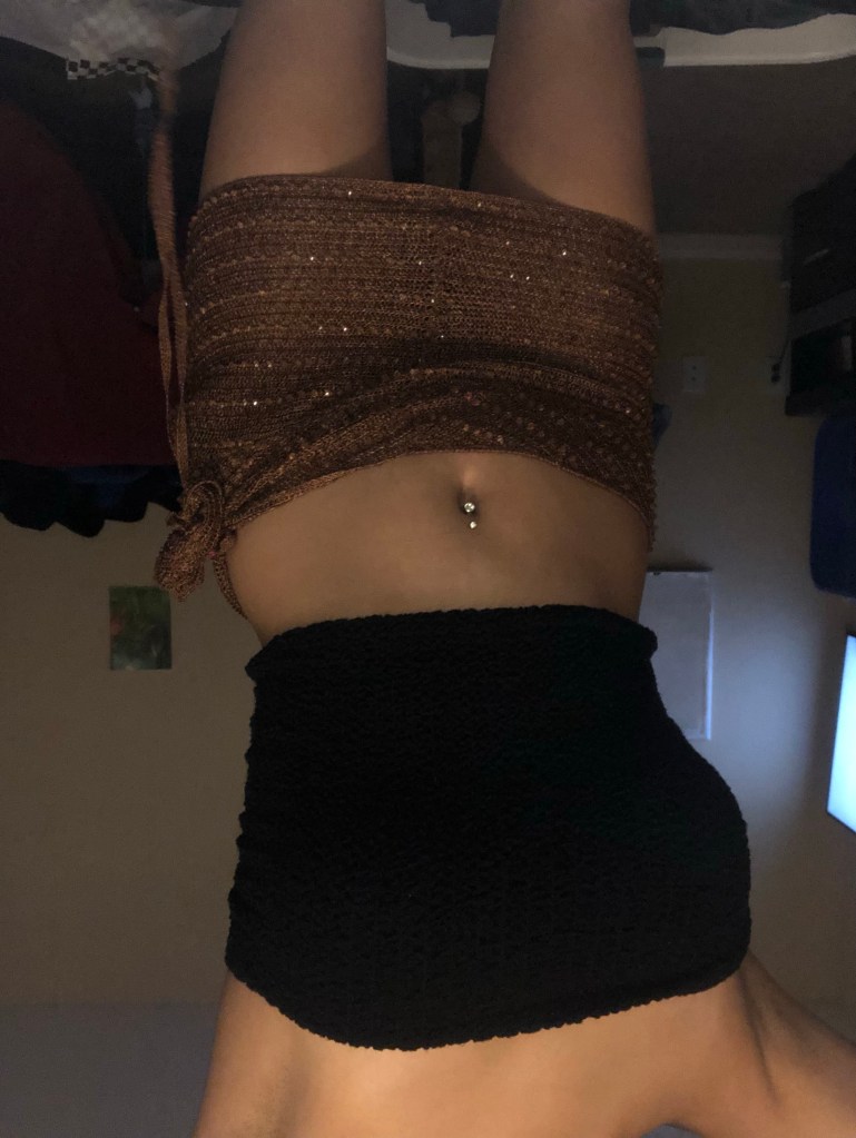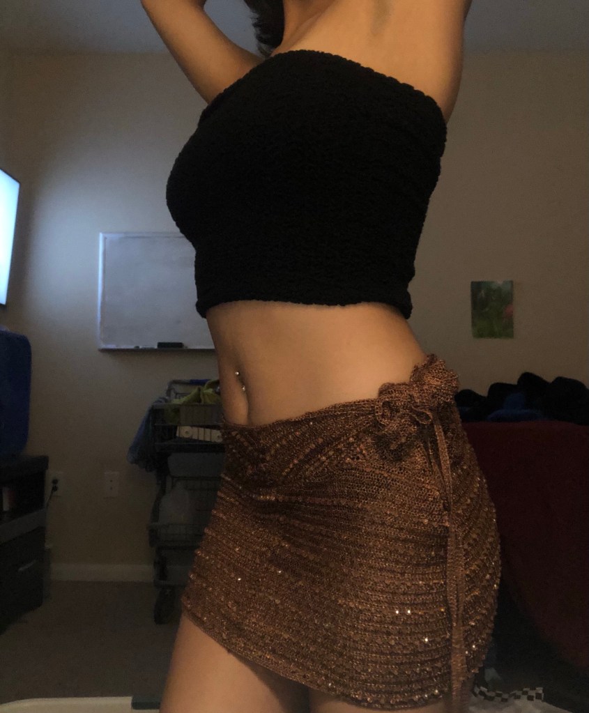 2. august 3rd ! “designed” a super simple mini skirt with the material from a old top i had. didn’t sew anything , i slipped the top on and sized it the way i wanted the mini skirt. these are samples , not the final result. i’m not sure if i should keep the bow on the side of the skirt or right in the middle on the back of the skirt.