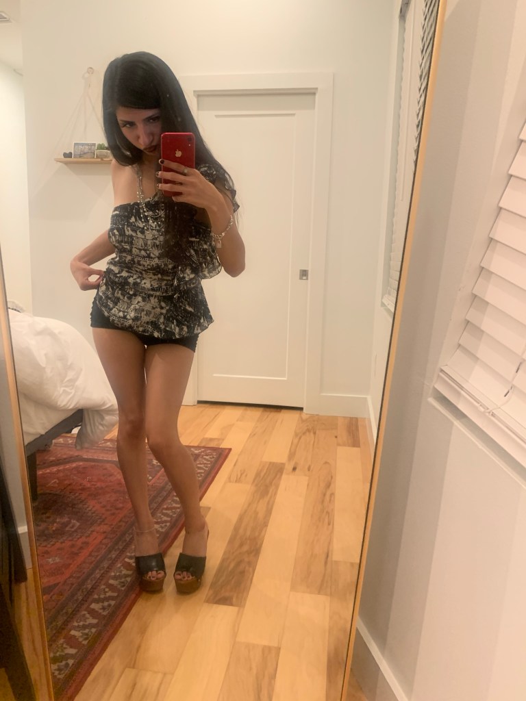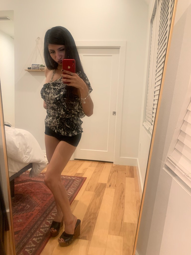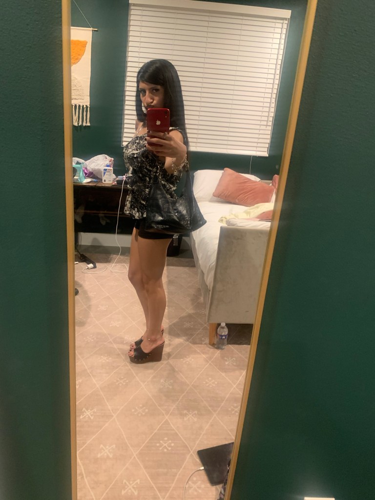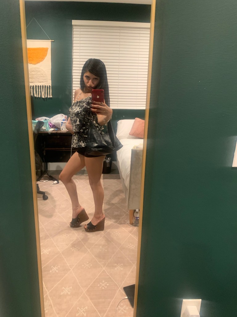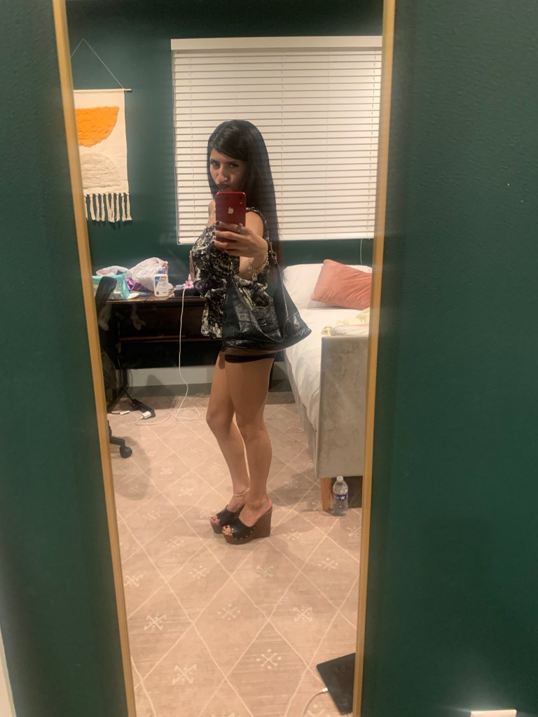 Option One shows a big black leather bag, while Option Two shows a small leather bag. I thought, well I’m going out to dinner, so I don’t need to carry much. My statement piece is my top, so it needs to always be visible. I’m wearing mini shorts & I have a mini bag. Perfect! Mini bag Wins! Which do you choose? & give a good fashion answer!