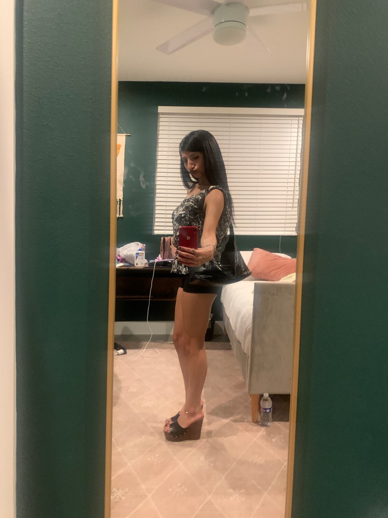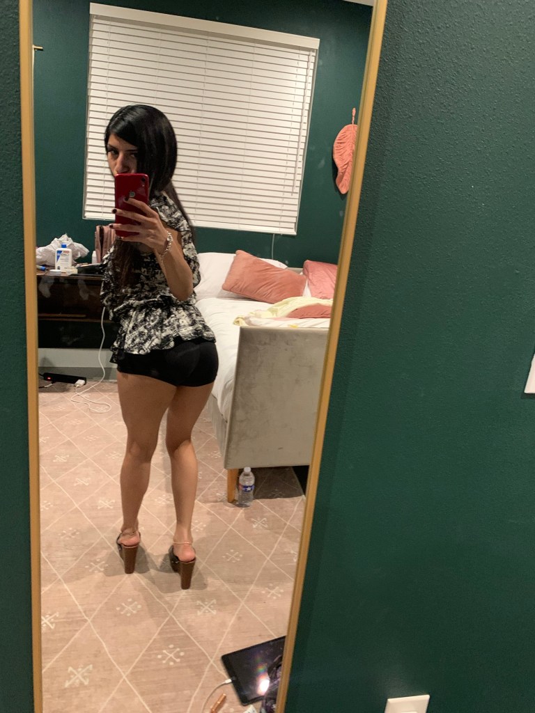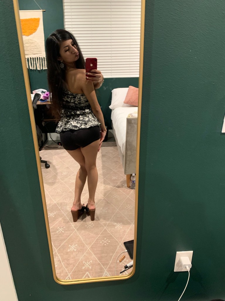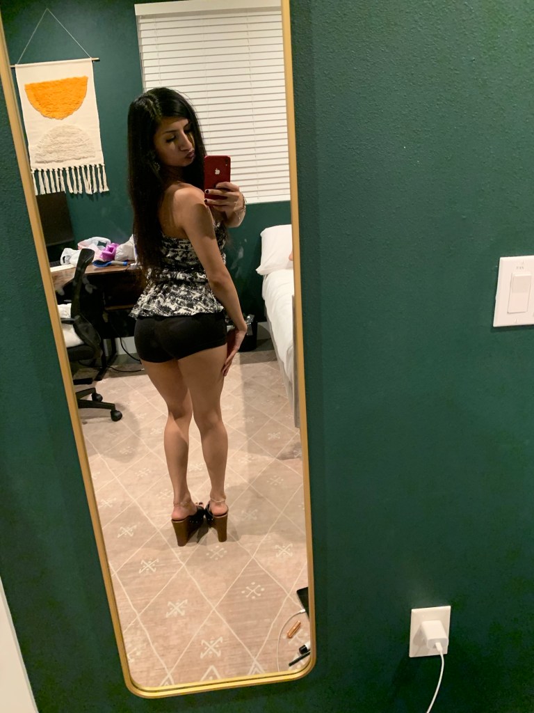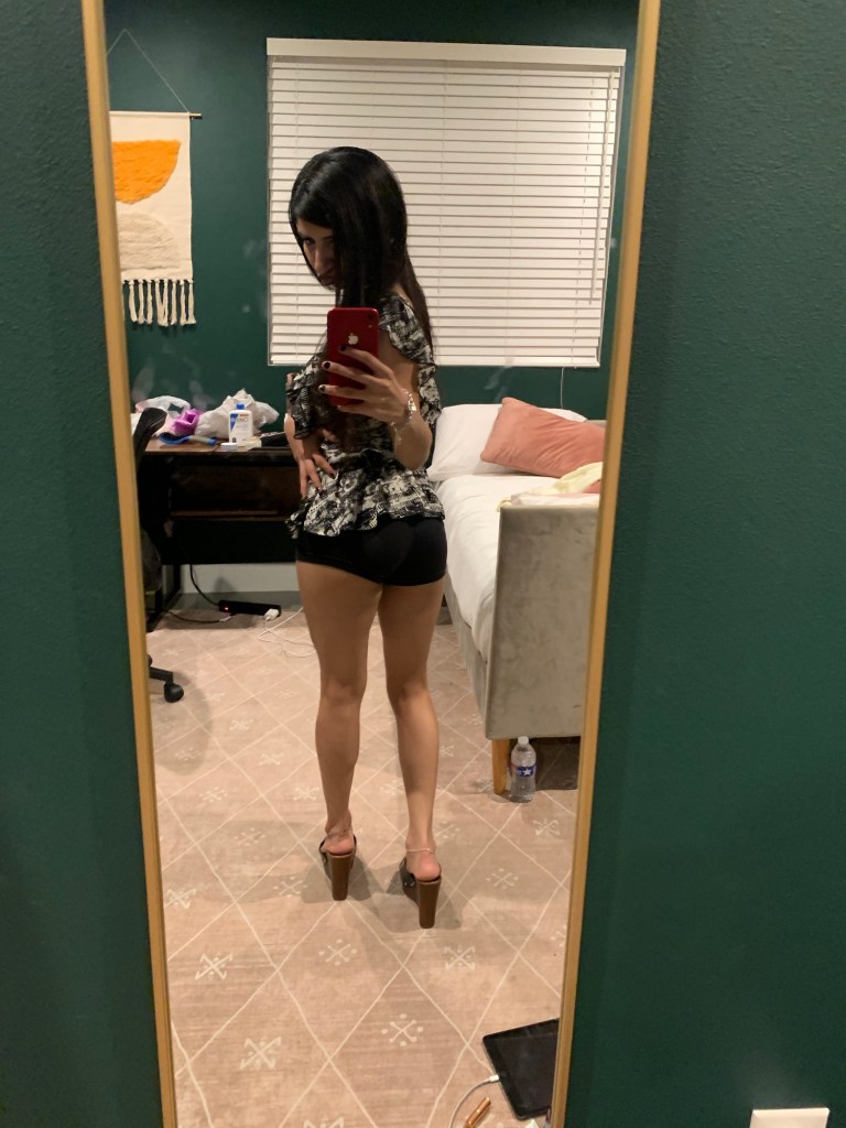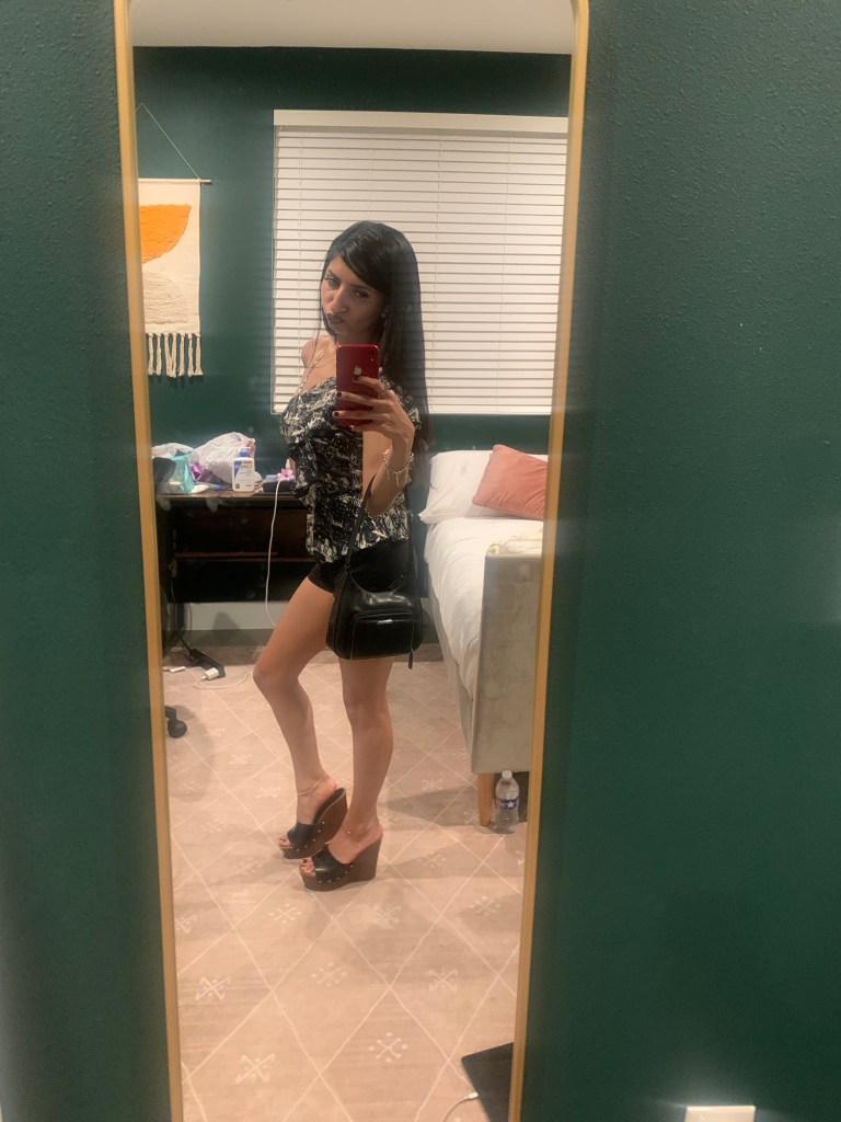 Option One shows a big black leather bag, while Option Two shows a small leather bag. I thought, well I’m going out to dinner, so I don’t need to carry much. My statement piece is my top, so it needs to always be visible. I’m wearing mini shorts & I have a mini bag. Perfect! Mini bag Wins! Which do you choose? & give a good fashion answer!