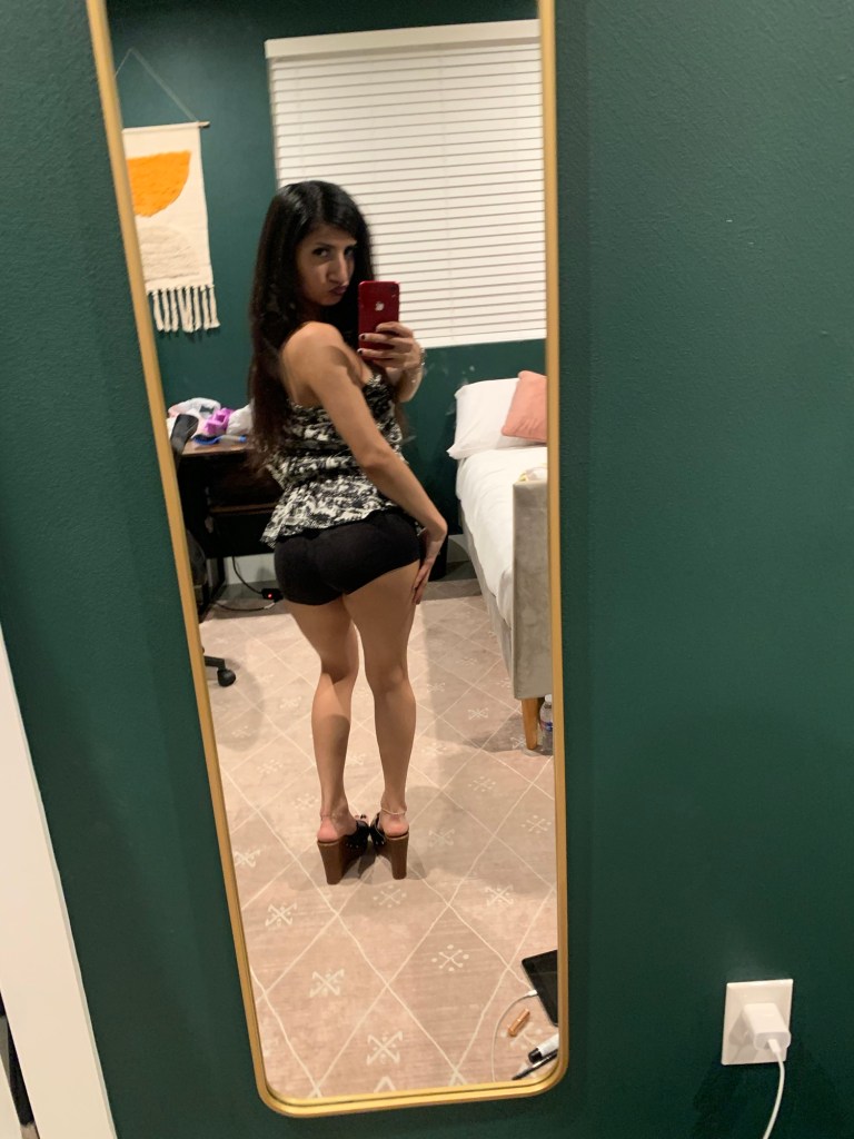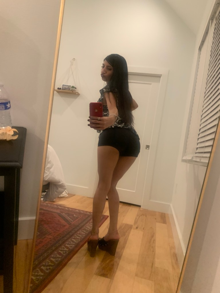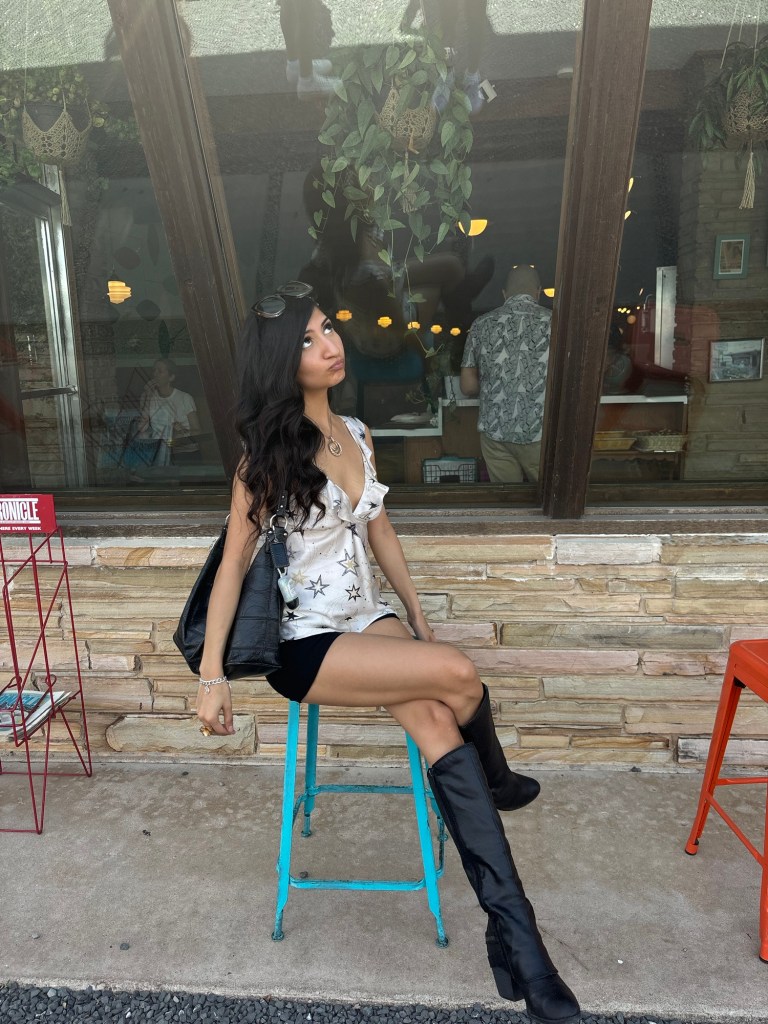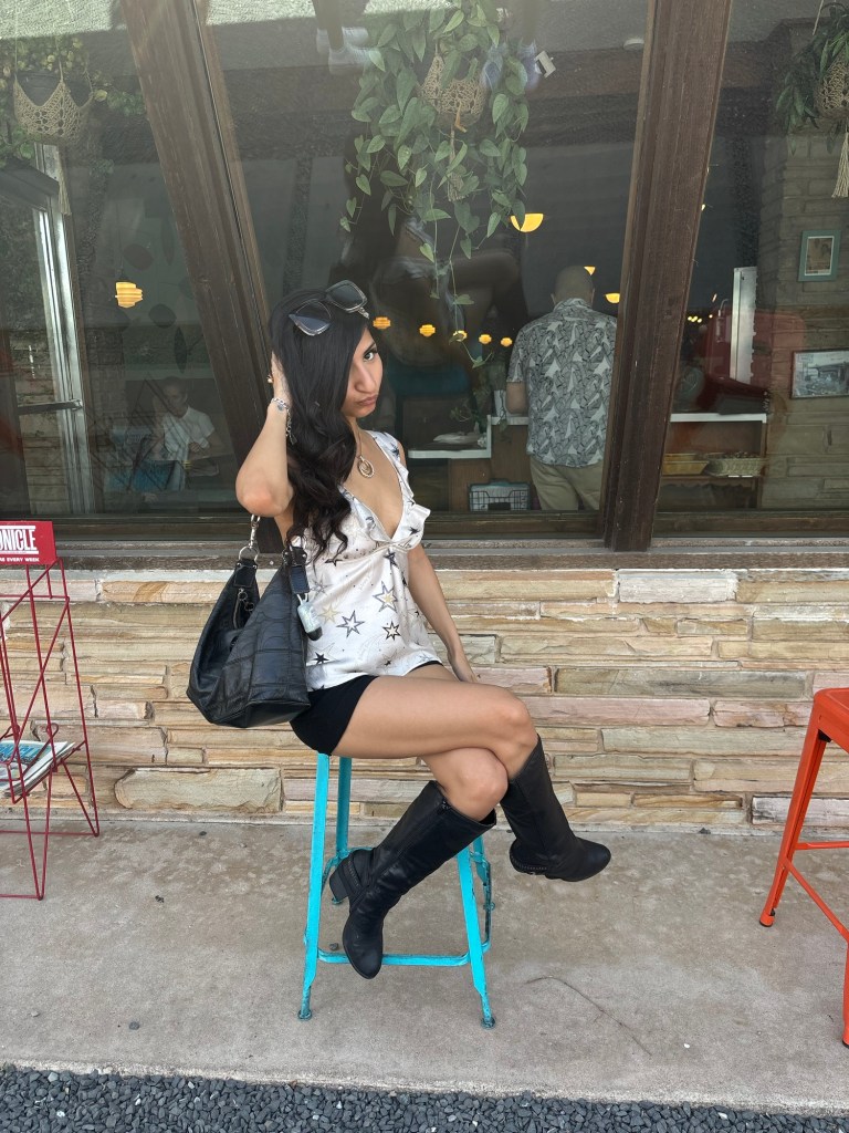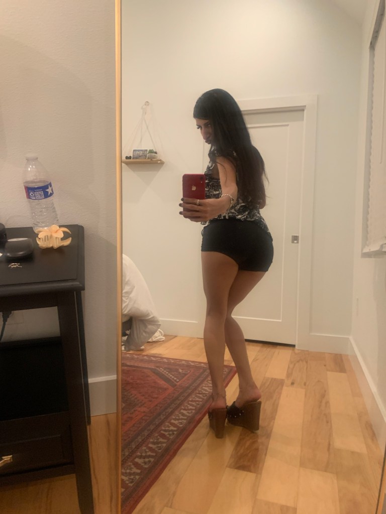 Option One shows a big black leather bag, while Option Two shows a small leather bag. I thought, well I’m going out to dinner, so I don’t need to carry much. My statement piece is my top, so it needs to always be visible. I’m wearing mini shorts & I have a mini bag. Perfect! Mini bag Wins! Which do you choose? & give a good fashion answer!