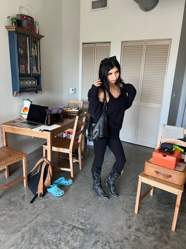 A Fall/Winter classic is mini shorts! of course you can expand your fashion mind & go hunting for different colors,lengths, patterns etc. This is an example of the #TexasTip in practice. A Spring/Summer piece; Shorts, in a Fall/Winter color; Black.