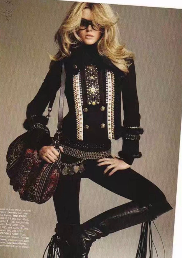 I mean where do we begin. This is a modern outfit with hints of #boho. seen by the choice of black leather, black fringed boots, off the solder bag, and gold waist-belt.