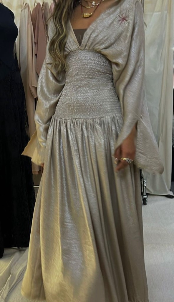 This metallic-silver gown models what a 2025 boho piece consist of! Bringing in the flowy sleeve. A perfect whisper of #boho is felt within its’ silk blends! Giving a silhouette one can’t help but admire. Who knew sleeves could hold so much power?